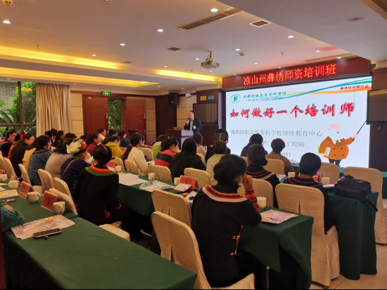 11月10日,2020年凉山彝族自治州彝绣师资培训班在西昌市开班。成都纺织高等专科学校作为协办单位,全程参与培训班的前期调研策划、方案制定、课程设置,并派出学校继续教育中心主任谈青豹、艺术学院院长刘畅和蜀锦蜀绣研究中心主任朱利容教授承担了培训班的主要授课任务。