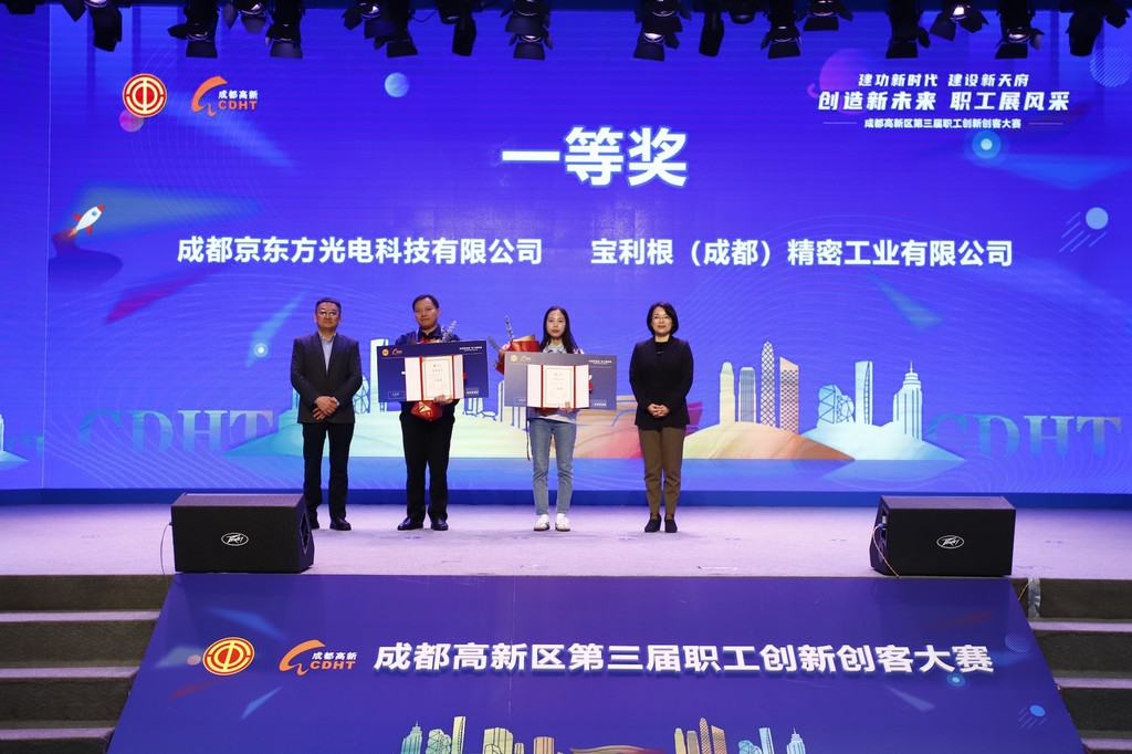 11月13日,成都高新区第三届职工创新创客大赛在菁蓉汇落幕,经过激烈角逐,来自成都京东方光电科技有限公司的“高端OLED手机屏幕制程中有机发光材料降本增效”项目和宝利根(成都)精密工业有限公司的“模具结构平动补偿双色注塑机台定位误差”项目获得一等奖。