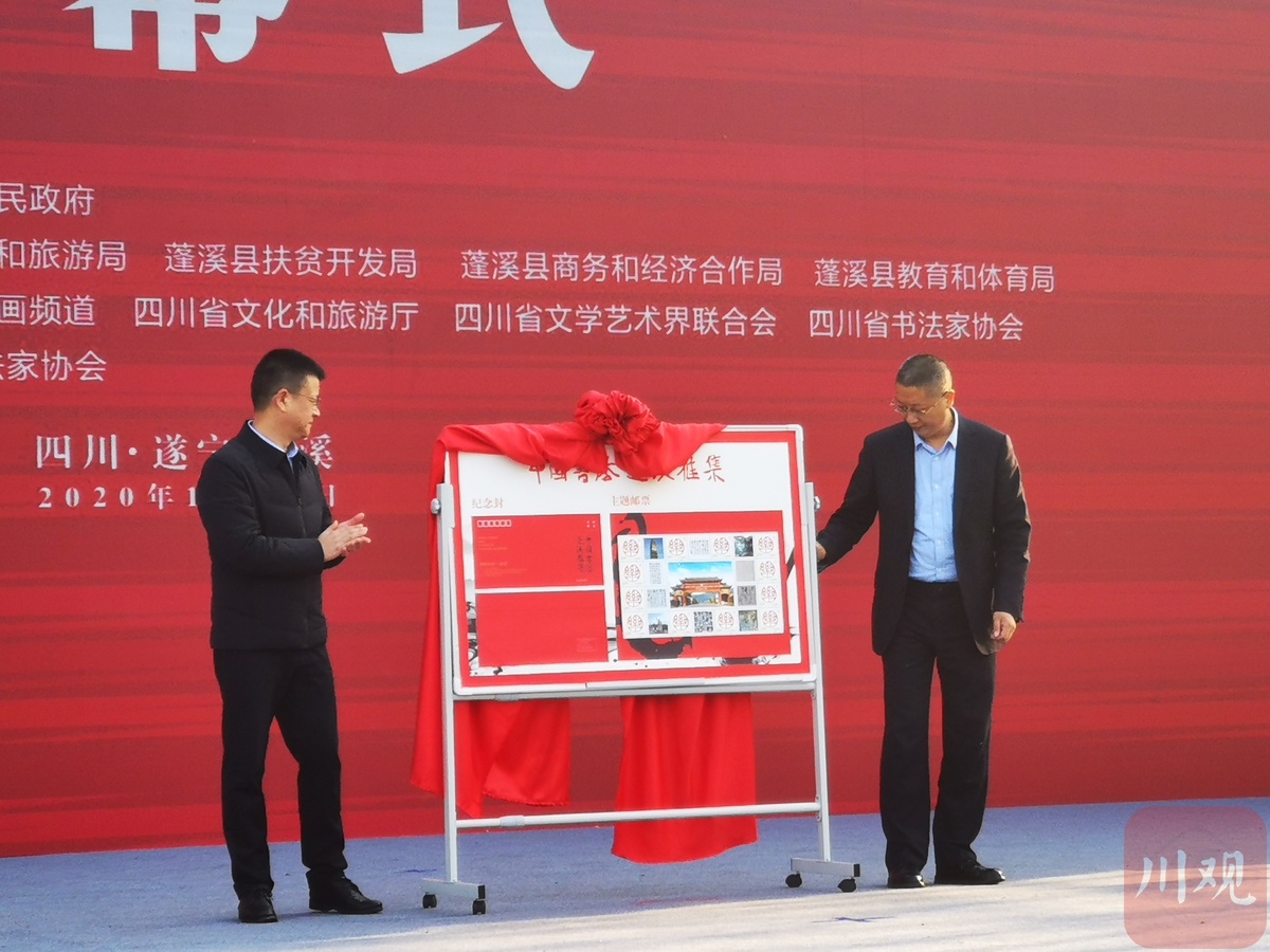 开幕式上,首发“中国书法 蓬溪雅集”主题邮票及纪念信封;中央数字书画频道董事局主席王平为蓬溪县授予“中央数字书画频道拍摄制作基地”牌匾;中国国家画院原副院长、中国国家画院院委、书法篆刻院原执行院长曾来德讲话、捐赠书法作品100件。