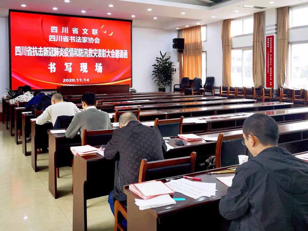 11月14日17时10分, 中国书法家协会会员、四川省书法家协会正书委员会委员、书法家邓长春在稍做休息后,定了定睛,再次提起毛笔,在四川省抗击新冠肺炎疫情和防汛救灾表彰大会邀请函上写起书法。