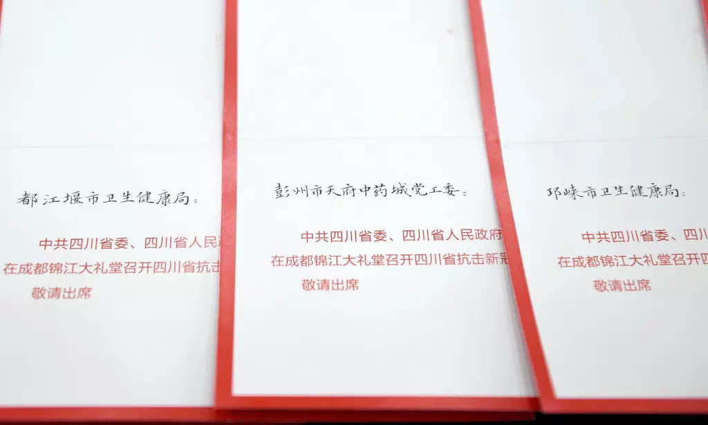 这是他今天写的第92张邀请函,也是他连续伏案书写的第8个小时。从上午8点半开始,四川省书法家协会主席戴跃率领副主席林峤、王道义,以及精于小楷创作的苟建勋、邓长春、吴艾伦等13位书法名家,为即将参加表彰大会的先进个人、先进集体书写1321份邀请函。