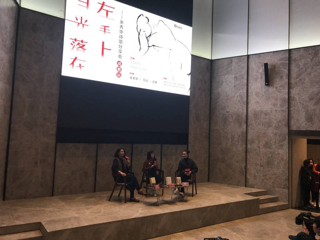 11月15日,“月光落在左手上——余秀华诗歌分享会·成都站”在文轩BOOKS招商店举行,诗人余秀华携新版《月光落在左手上》做客成都,与服装设计师、主持人宁远,水彩画家尤琳一道,探讨自己对于诗歌以及现世情爱的思考。