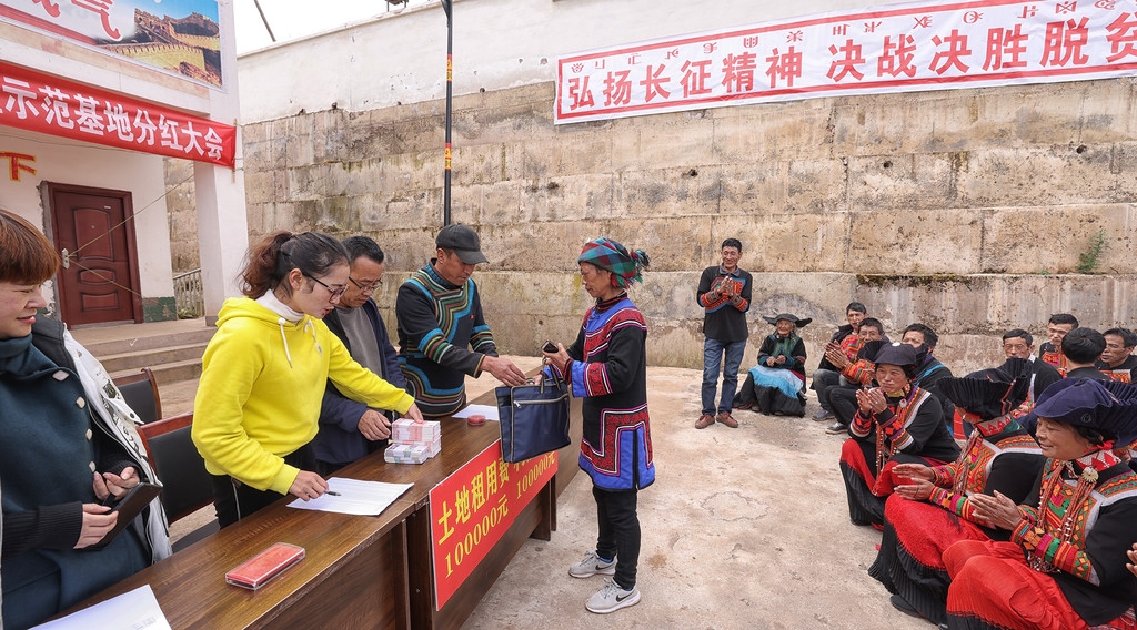 “勒格尔布、吉牛尔普、克日约罗、尼尼月古、吉牛拉洛,请上来领分红。”13日上午10时,天空放晴,分红大会正式开始,吾门村第一驻村书记杨小霞按着《分红花名册》的顺序请村民依次按下红手印。