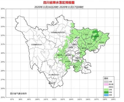 预计今天(11月16日)晚上,盆地大部多云转阴有小雨或零星小雨,其中巴中有中雨;川西高原和攀西地区大部天气晴好。