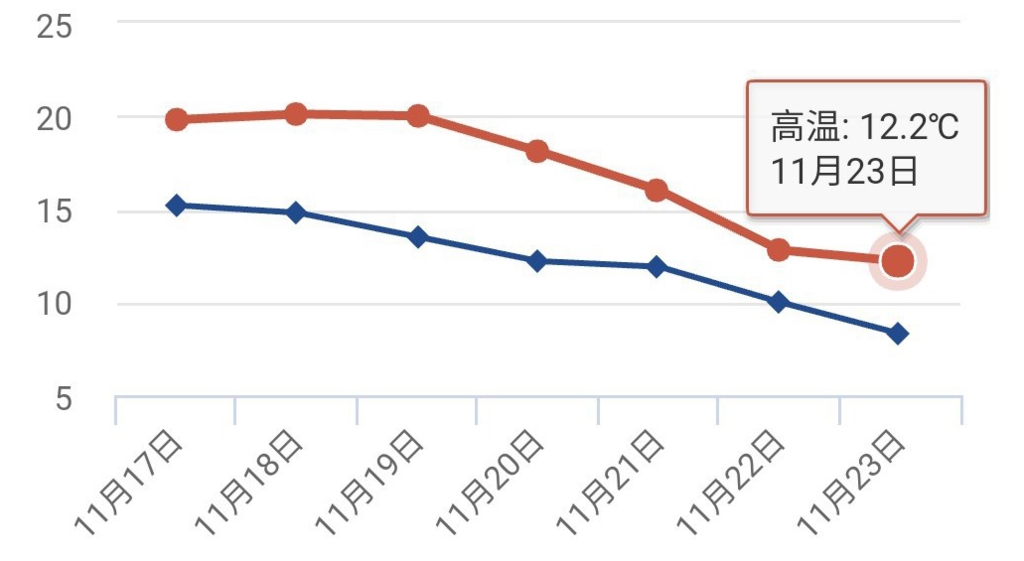 四川省气象台预计,11月20日~23日,盆地大部阴天有小雨或零星小雨,日平均气温累计下降5~8°C,最高气温将降到10°C左右。