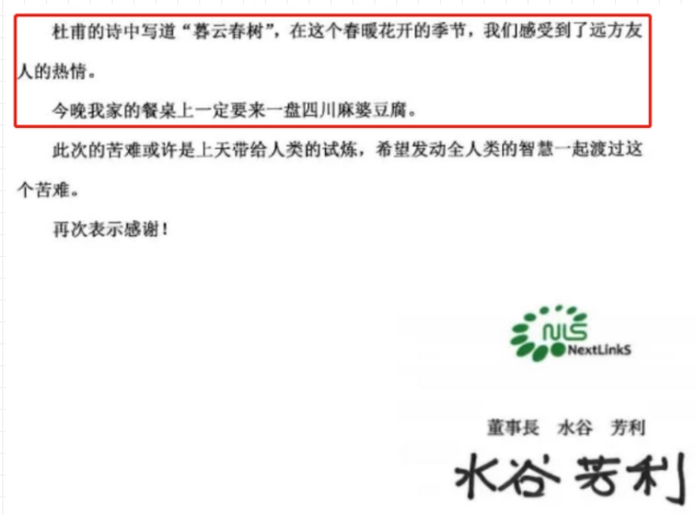 今年4月,疫情最为严重的时刻,为了表达对四川资助抗疫物资的感谢,日本后续链接公司(NextLinkS)董事长水谷芳利先生,给我们回信,他在信中写道↓