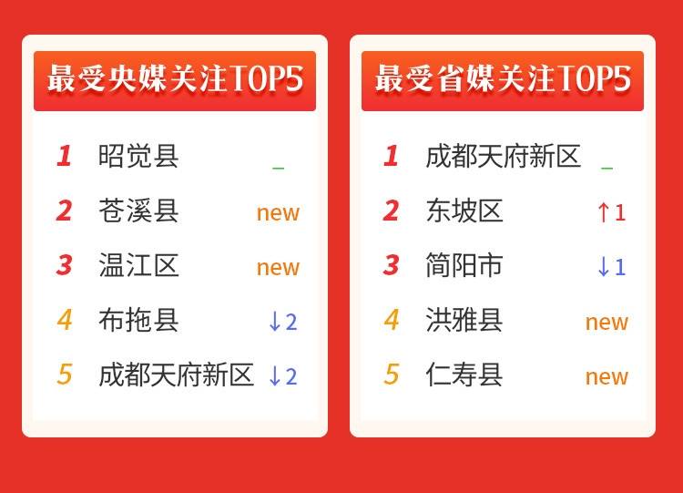 在央媒关注榜中,凉山州昭觉县、广元市苍溪县、成都市温江区、凉山州布拖县、成都天府新区名列最受央媒关注前5名。凉山州脱贫攻坚进展、成都大学党委书记毛洪涛溺水身亡、泪别广元苍溪“警号035225”民警李雨阗、成都天府国际机场动态成为央媒聚焦的热点事件。