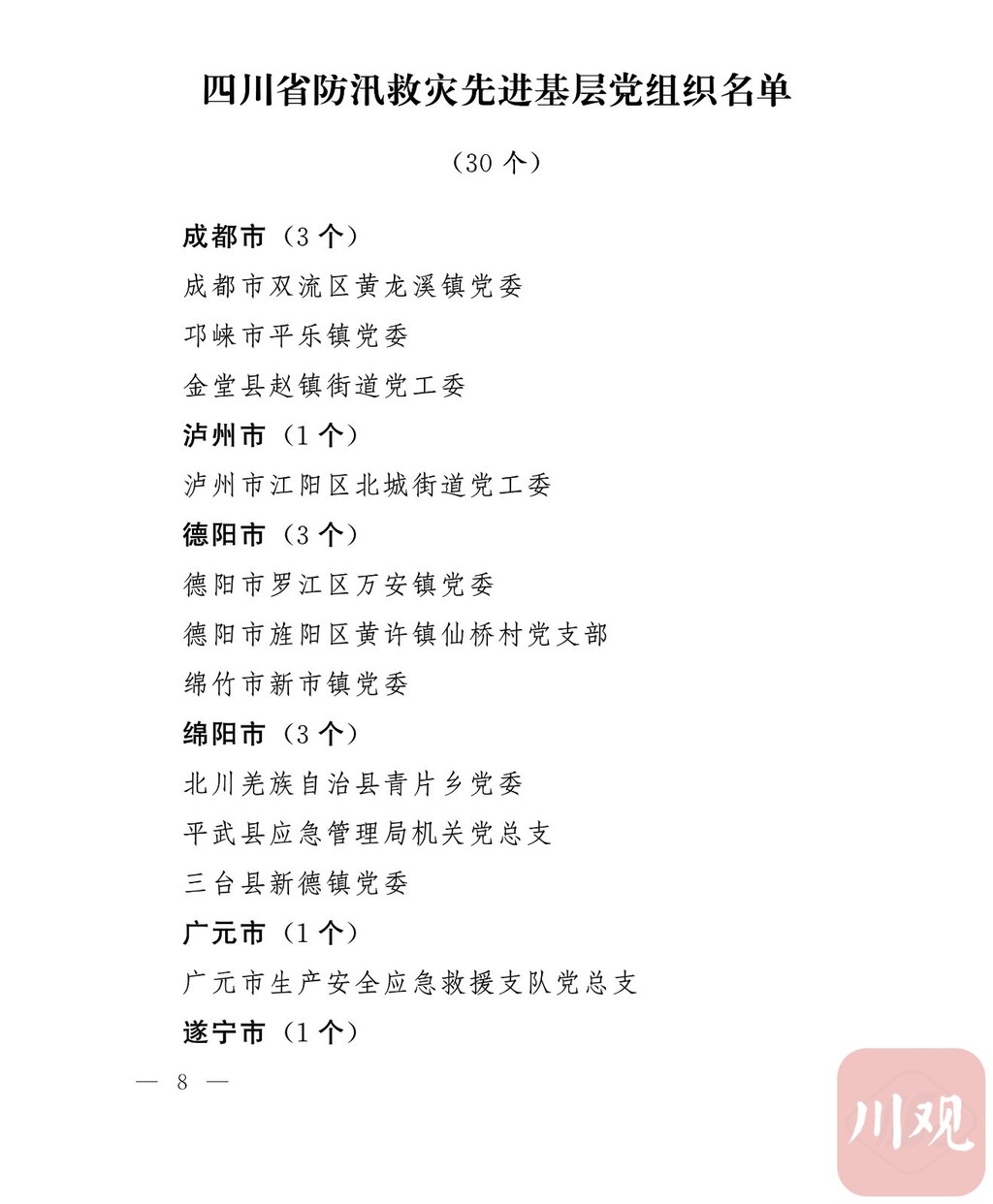 今年入汛以来,我省遭遇严重洪涝灾害,降雨强度、流域水情和新增地质灾害屡超历史记录,特别是“8·11”“8·18”两轮历史罕见的极端持续暴雨天气过程中,江河洪水、山洪、泥石流、城市内涝等灾害接连暴发,人民群众生命财产安全受到严重威胁。面对重大险情灾情,各级党组织和广大党员干部坚决贯彻习近平总书记关于防灾减灾救灾重要指示批示精神,认真落实党中央和省委决策部署,坚持人民至上、生命至上,以汛为令、冲锋在前,全力以赴打赢了防汛减灾、安全度汛这场硬仗,涌现出一大批先进典型。为激励先进、鼓舞士气,省委决定,授予陈奎安等50名共产党员“四川省优秀共产党员”称号,授予成都市双流区黄龙溪镇党委等30个基层党组织“四川省先进基层党组织”称号。