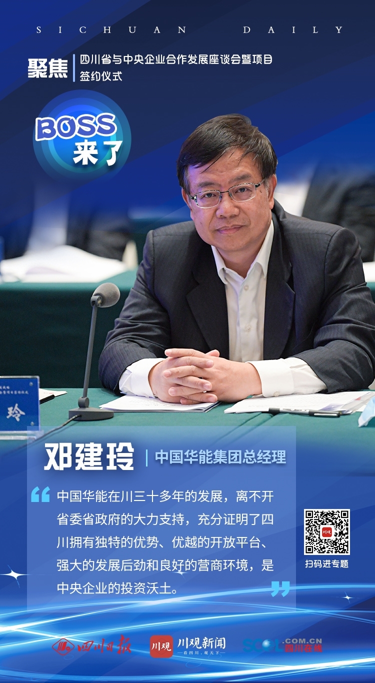 “作为最早入川的发电央企,中国华能始终把四川作为发展战略要地。”11月17日,在四川省与中央企业合作发展座谈会暨项目签约仪式上,中国华能集团总经理邓建玲表示,“十四五”期间,中国华能将在四川再新增投资1000亿元,带动上游设备产业约400亿元,拉动GDP约2000亿元。