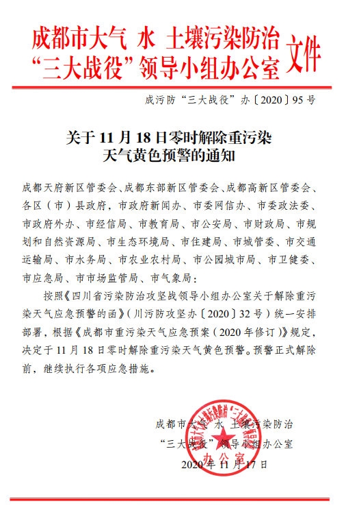 根据省环境监测总站与省气象台联合会商研判,我省盆地区域污染气象条件逐渐好转,按照《四川省污染防治攻坚战领导小组办公室关于解除重污染天气应急预警的函》(川污防攻坚办〔2020〕32号)统一安排部署,成都市决定于11月18日零时解除重污染天气黄色预警。预警正式解除前,继续执行各项应急措施。