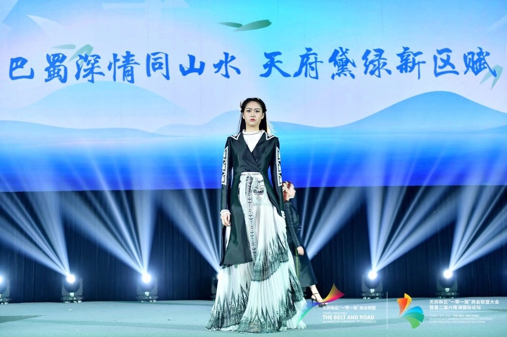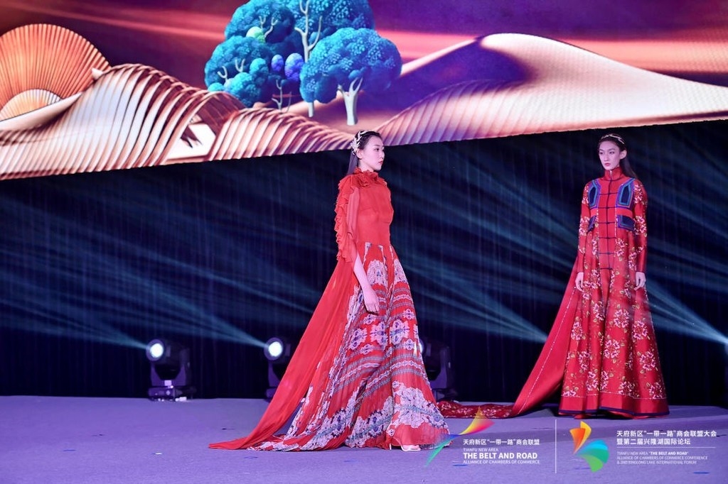 11月17日下午,2020中外知名企业四川行专项活动之一,2020侨界川渝菁英汇活动・天府新区“一带一路”商会联盟大会暨第二届兴隆湖国际论坛在成都举办。在进行完领导讲话、相关方签约等议程后,参会人员正以为将按活动日程进行主旨演讲时,会场突然暗了下来,几秒钟后,会场响起节奏感极强的音乐,伴随着摇曳的灯光,数位身材高挑的模特身穿各类充满设计感的衣服,开始登台走秀。