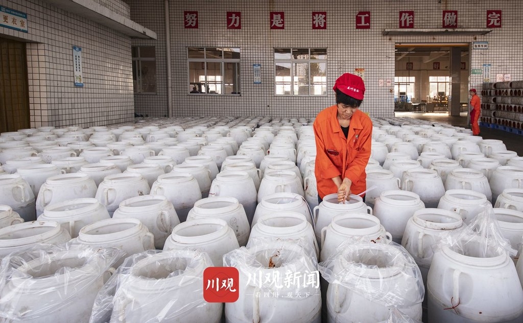 11月17日,广安市前锋区工业园区,一食品加工企业豆瓣酱生产现场,机械手有条不紊的搅拌着豆瓣,工人则把搅拌好的豆瓣存放到发酵容器中。