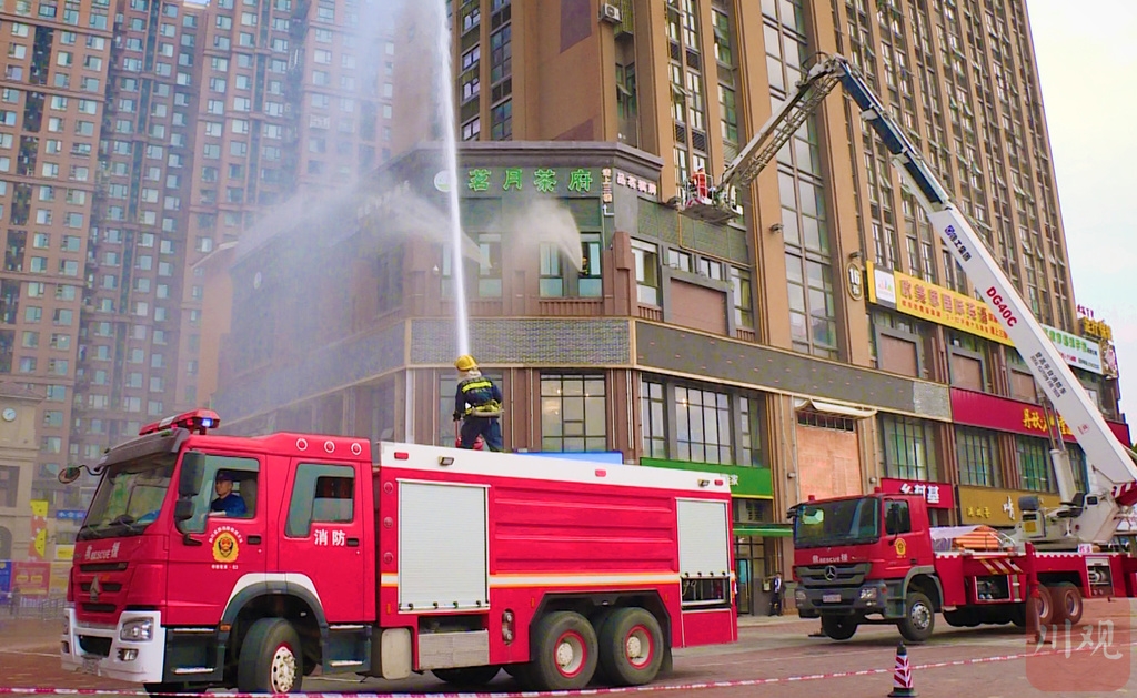 一系列紧急反应,迅速展开:社区和物业工作人员紧急集结开展人员疏散、现场秩序维护、组织义务消防力量紧急集结,紧接着,两辆消防车呼啸而来,开始灭火。同时,消防队员通过消防车升降装置救援被困楼顶的市民。医疗救护人员随时待命,准备抢救伤员……这是一场由蓝光嘉宝服务、成都市郫都区消防救援大队、郫都区福梓社区和犀浦医院共同带来的消防紧急演练。