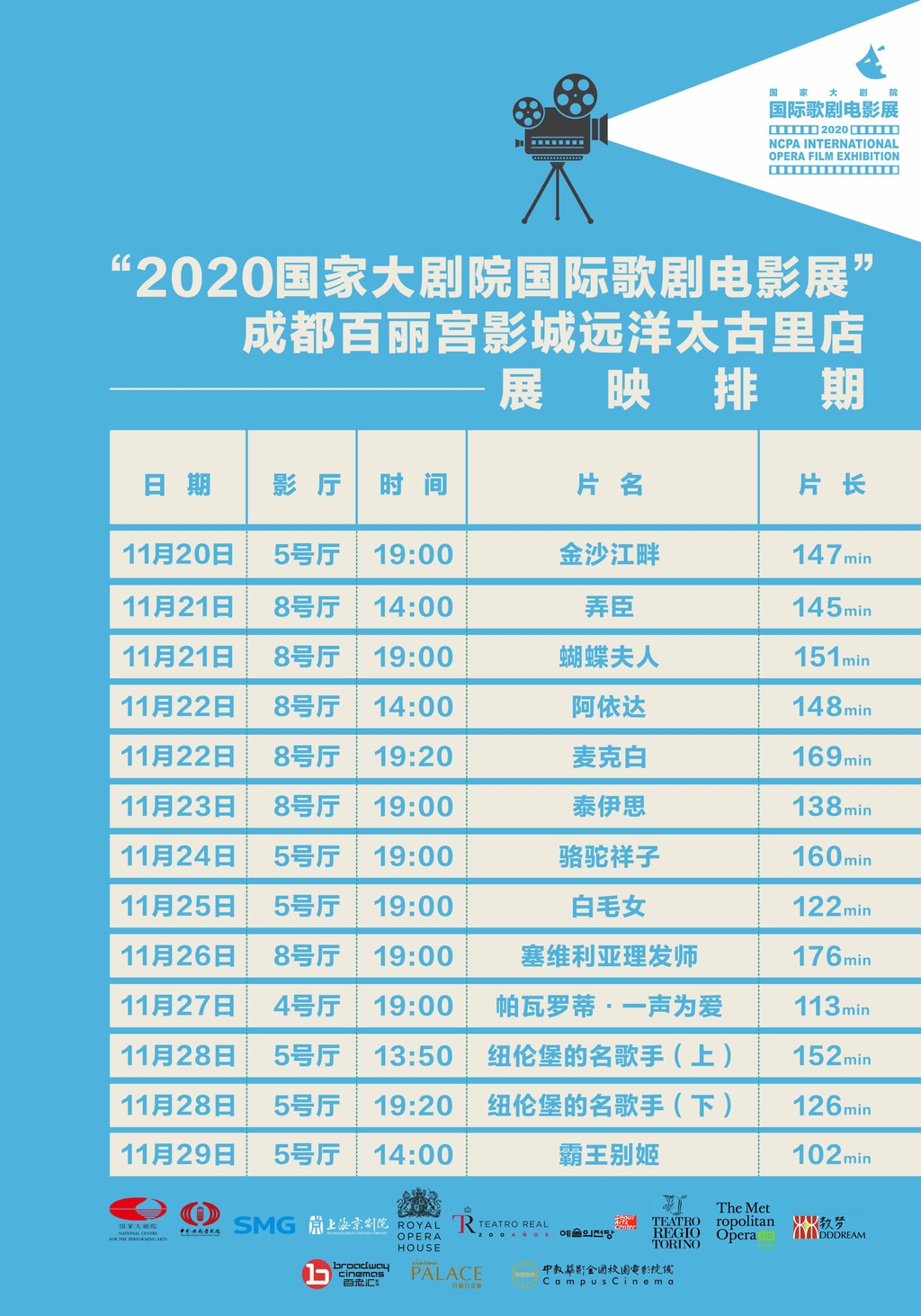 成都站活动将于11月20日至11月29日在百丽宫影城远洋太古里店和百丽宫影城凯德天府店进行展映,为观众奉上《蝴蝶夫人》、《麦克白》、《弄臣》、《白毛女》等10余部中外歌剧电影,让大家有机会在家门口的大银幕上欣赏不同的歌剧艺术。