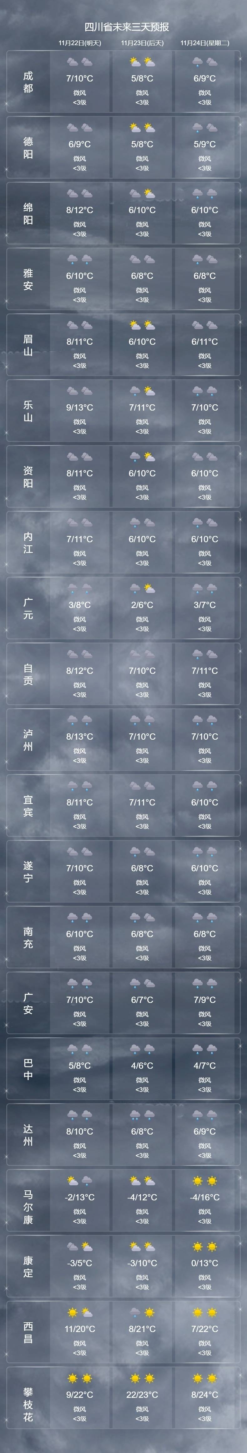 今天晚上:盆地各市阴天有小雨,西部、北部高海拔山区有雨夹雪,冷空气影响时有2~4级偏北风,山口河谷地区风力将达6级或以上;甘孜州西北部、阿坝州大部及凉山州东北部阴天间多云有阵雪(雨),局部地方中到大雪,川西高原和攀西地区其余地方晴。