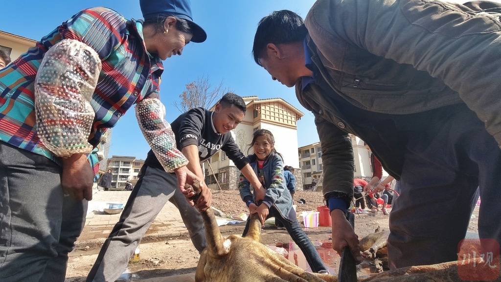据沐恩邸社区何军书记介绍,该社区共有1258户6258人,他们来自全县27个行政村,生活习惯多元化。这是脱贫后的第一个彝历新年,为了增进社区居民的感情交流,社区组织大家一起杀年猪,跳达体舞,一起欢乐过年,拉近彼此距离。仅20日一天,社区就集中宰杀了500多头猪——彝历新年在彝语中被称为“库史”,是彝族“嘴巴的节日”,而杀年猪,是彝族人迎接彝历新年的重要活动之一。