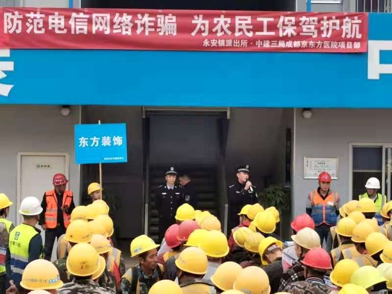 为进一步提高工地农民工兄弟防范电信诈骗的意识和能力,预防和减少电信诈骗案件的发生,应中建三局成都京东方医院项目工会邀请,11月21日,成都市双流区永安镇派出所民警来到该项目,开展“防范网络电信诈骗,为农民工保驾护航”宣讲活动,提高农民工防范电信诈骗的意识和能力,全力守护农民工的“钱袋子”。