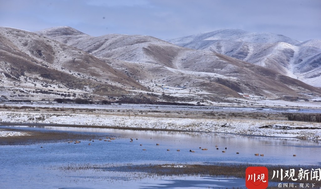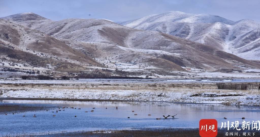 11月22日,农历二十四节气小雪,阿坝州红原县被白雪覆盖。一群南迁的黑颈鹤唳鸣之中,鹤群结队排成一字形从白雪皑皑的山脊上飞过,它们冒着冬天的雨雪,顺着寒流的风向,一路向南。这个优美的场景被当地摄影师易佑林见到并抓拍下。据易佑林介绍,当日上午11点左右他正在下哈拉村附近的湿地中拍摄绿头鸭过冬,突然听见空中一阵鹤鸣,20多只黑颈鹤一字排开整齐的往南飞去,他用相机记录下黑颈鹤在空中优美的姿态。作为鸟类摄影师的易佑林不光拍到黑颈鹤,他还拍到了大雁,这是在在红原大草原上去年才见到的鸟类。“草原上鸟类越来越多,这跟环境变好和人们保护意思加强有关系,”易佑林说。