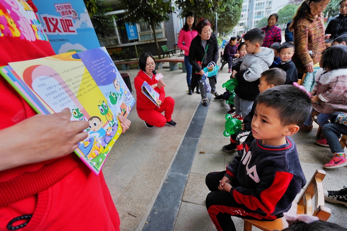 “兵兵见了爷爷,用‘喂喂喂’打招呼;兵兵要让爸爸妈妈帮忙,也是‘喂喂喂’……小朋友们觉得兵兵这样做有什么不妥?”11月21日下午,文轩姐姐林子在成都市双流区长埂新居小区的一株百年榕树下,为35名小朋友以及40余名家长们上了一堂亲子阅读课。课题主题是告诉孩子如何提高自己的礼仪,让孩子们带动家长一起爱护小区环境。