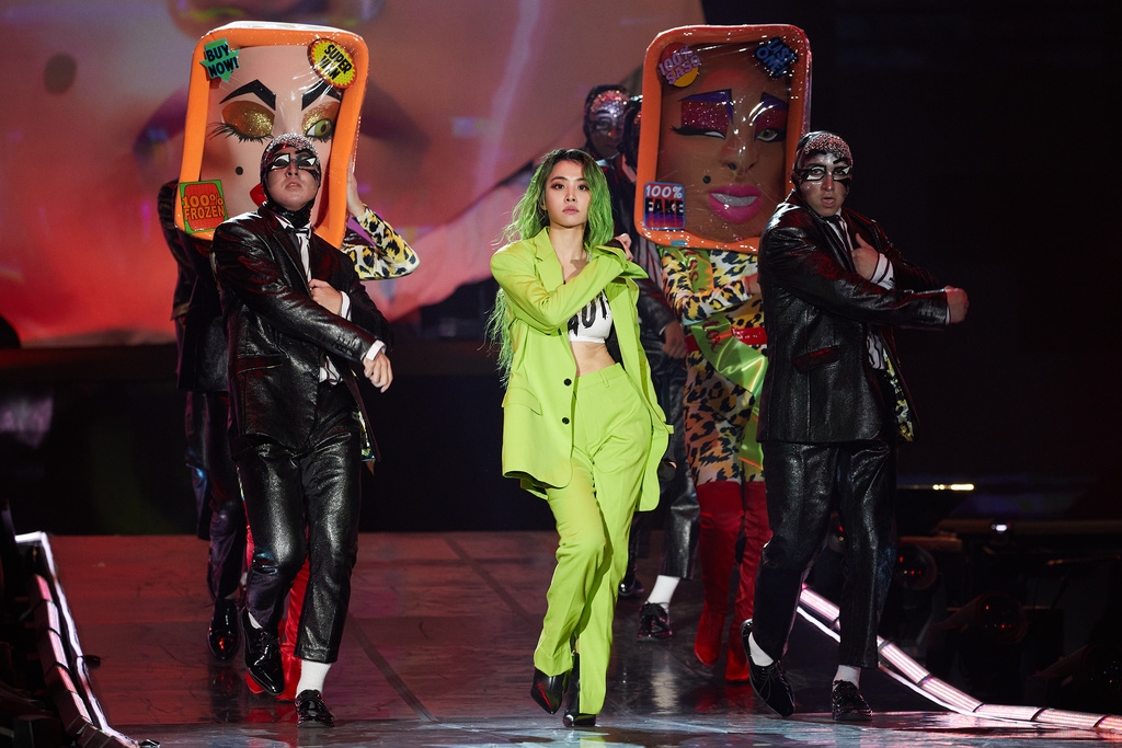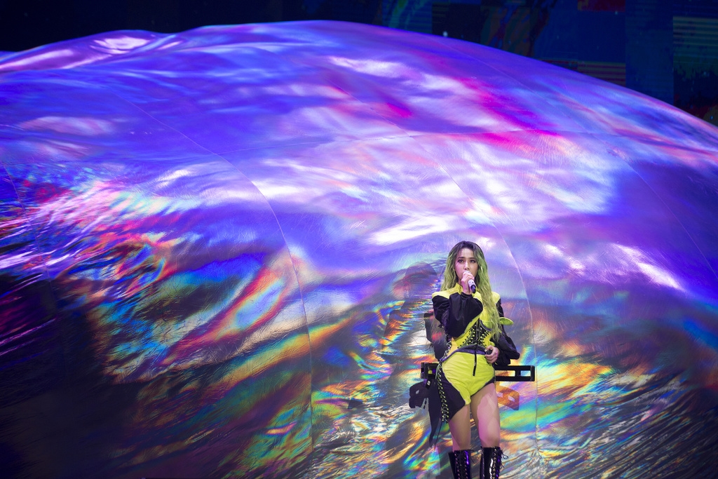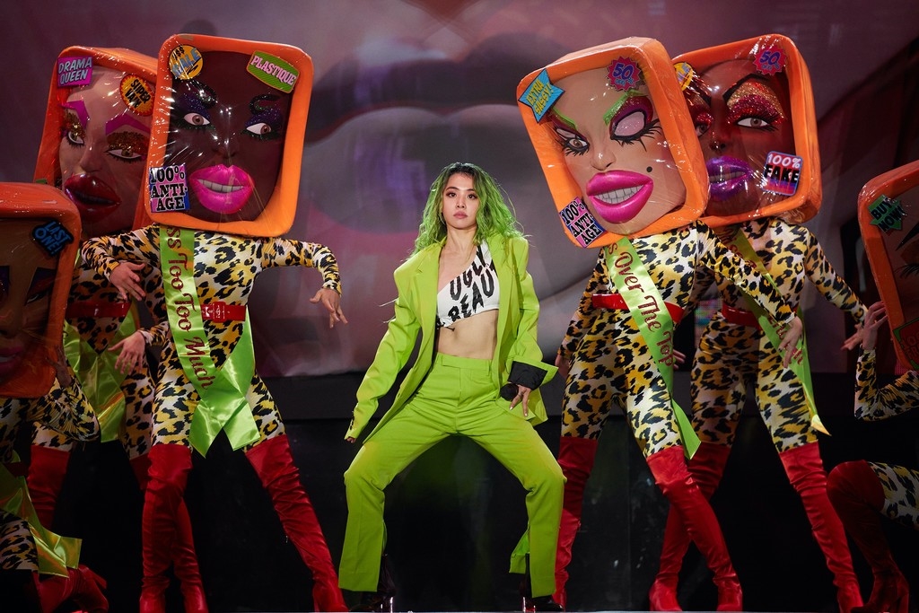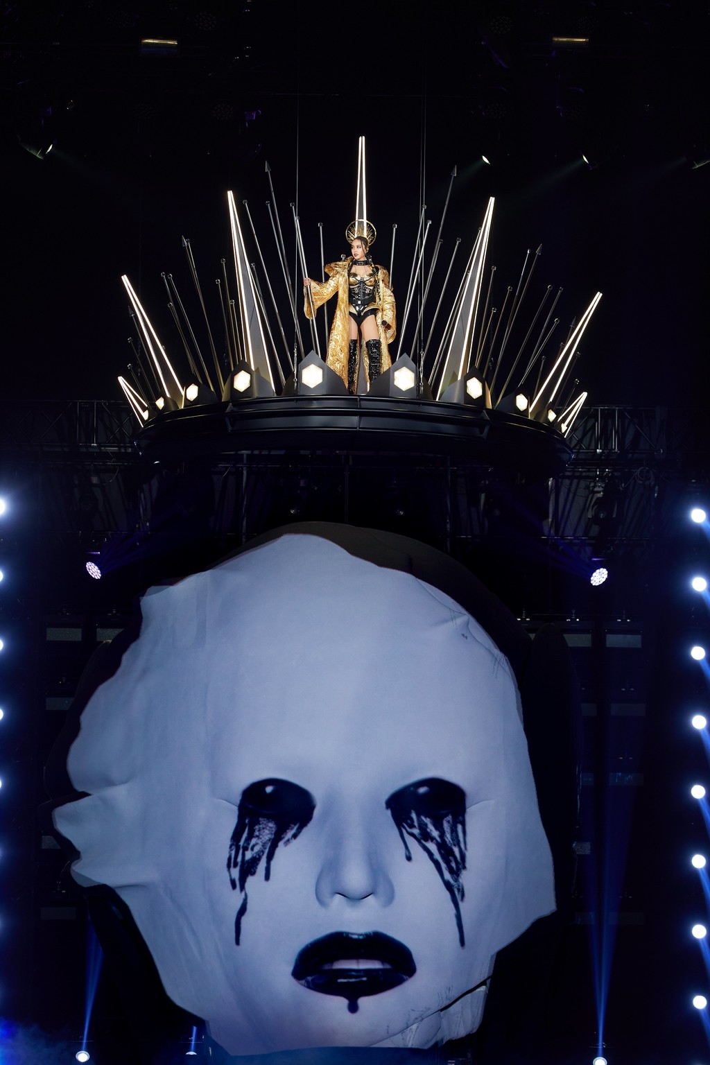 为唤起歌迷对“Ugly Beauty”起承转合魔幻六章节的记忆,此次演唱会特别在视觉上增加了画龙点睛的新意,其中在开场化身恶之女王登七层楼高“提头”现身的蔡依林,这次还特别为它加冕了一个巨型“恶之皇冠”,气势凌人宛如升级恶之女王2.0版的“坐骑”,更呼应战胜内心恐惧为自己喝采的意象。
