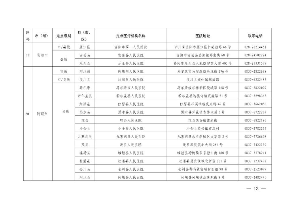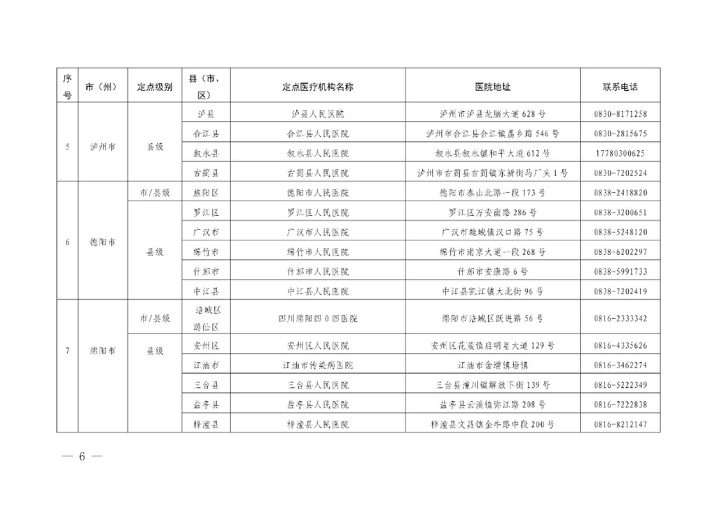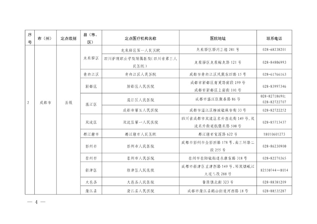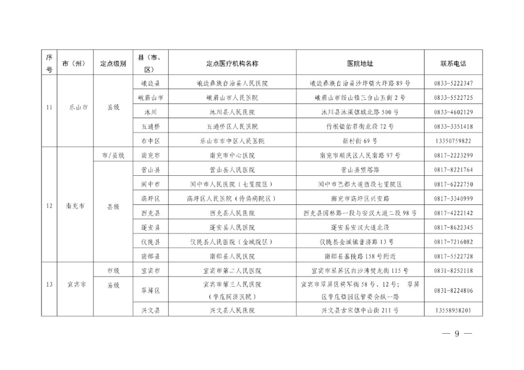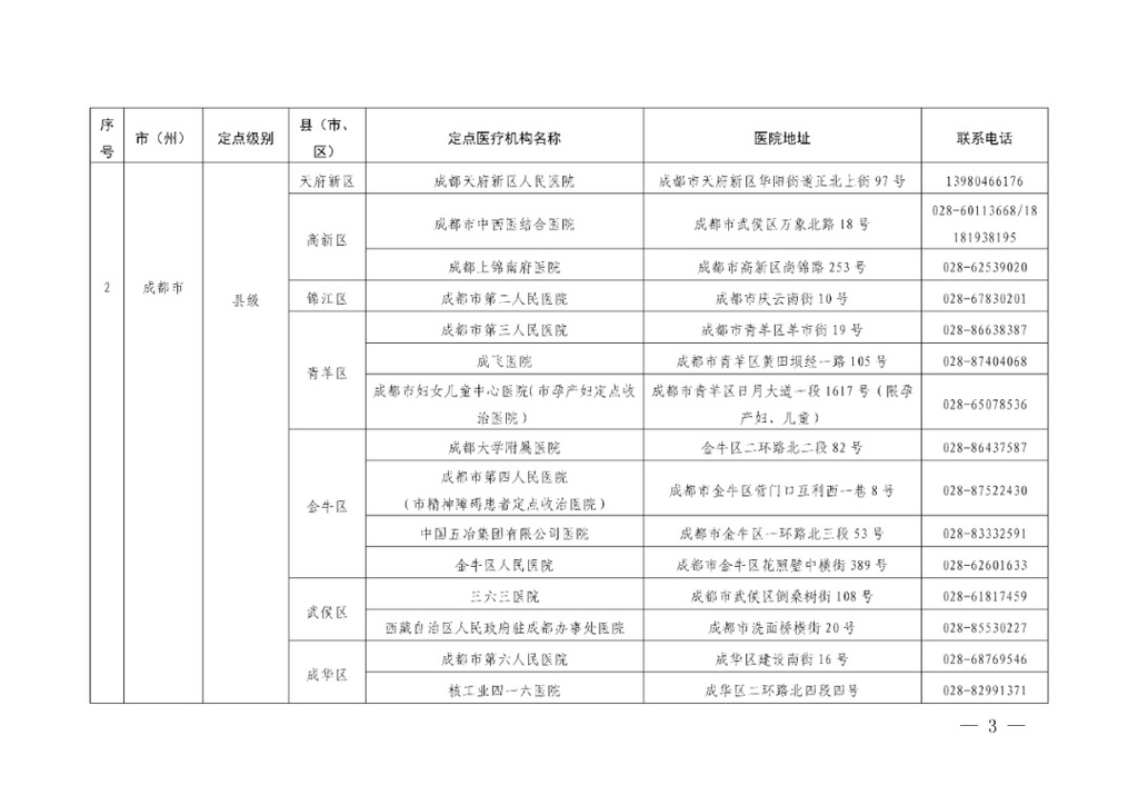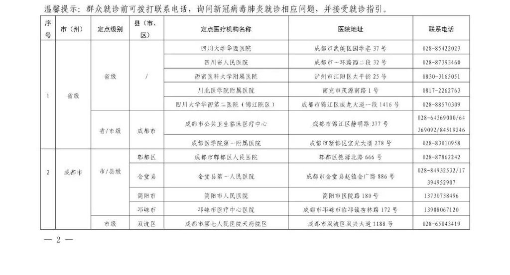 四川省应对新冠肺炎疫情救治定点医院信息
