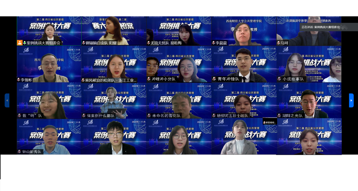 社会突发公共危机,“谁来敲响警钟”?大数据如何助力基层协同治理?乡村振兴战略背景下返乡农民如何成功创业?日前,第二届四川省公共管理案例挑战大赛举行,西南财经大学、四川大学、苏州大学、华中师范大学、东北大学等高校学子带着所关注的公共管理热点问题及各自的解决方案决战云端。从全国19所高校84支队伍中脱颖而出的16支决赛队伍立足中国场景、讲述中国故事、提炼中国实践、解决中国问题。