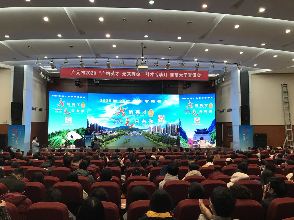 11月23日,广元市引才活动校园招聘会在重庆市西南大学圆顶报告厅举行,这是广元市今年“广纳英才·元来有你”引才活动月活动的主场。历时一个月的人才引进活动,广元组建多个引才小分队分赴成都、西安、兰州、绵阳、南充等城市,但主场活动设在重庆。