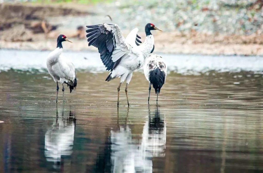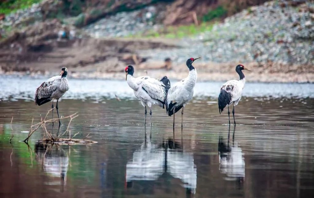 初冬时节,国家一级保护动物黑颈鹤开启了一年一度的“春运”模式,结群南迁越冬。近日,在雅安市芦山县吕村坝大桥附近,路过的群众拍下了黑颈鹤迁徙过境的珍贵影像。