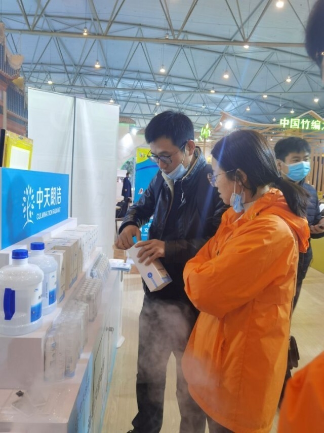 在中天朗洁的展台前,公司总经理王科刚正在热情地向顾客介绍公司的多功能消毒液。王科刚告诉记者,他们公司的产品解决了高稳定性的国际性难题。能在9秒钟时间内杀灭99.99%的病菌,是酒精消毒的80倍,84消毒液的250倍。
