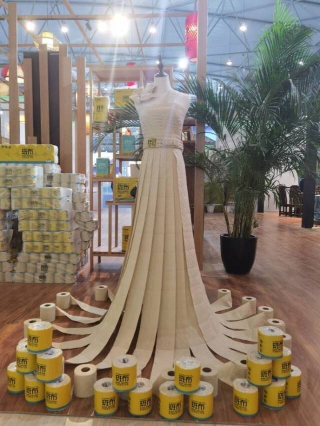 在斑布纸品的展台前,一个由本色纸装扮出来的模特儿吸引了众人关注的目光。本次展会上,斑布带来了抽纸、卷纸、手帕纸、随身包等十个单品参展,其中24包斑布量贩装正常售价79.9元,现场促销仅售49.9元。