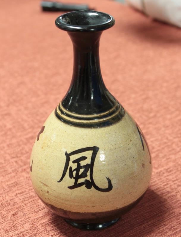 玉壶春瓶又叫玉壶春壶,它的造型是由唐代寺院里的净水瓶演变而来,其名称有人认为是因唐诗“玉壶先春”而得名。玉壶春瓶的造型定型于北宋时期,在当时是一种装酒的实用器具,后来逐渐演变为观赏性的陈设瓷。此瓶腹部绘有“风花雪月”四字,字体流畅,黑色的字体在黄底之上甚为醒目,黑黄二色搭配,色彩简洁明快。宋代汪洙撰的《神童诗》“诗酒琴棋客,风花雪月天”。