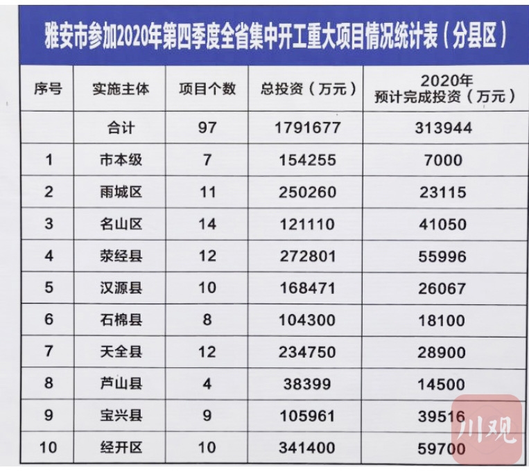 分县(区)看,市本级项目7个,总投资15.4亿元;雨城区项目11个,总投资25亿元;名山区项目14个,总投资12.1亿元;荥经县项目12个,总投资27.3亿元;汉源县项目10个,总投资16.8亿元;石棉县项目8个,总投资10.4亿元;天全县项目12个,总投资23.5亿元;芦山县项目4个,总投资3.8亿元;宝兴县项目9个,总投资10.6亿元;经开区项目10个,总投资34.1亿元。