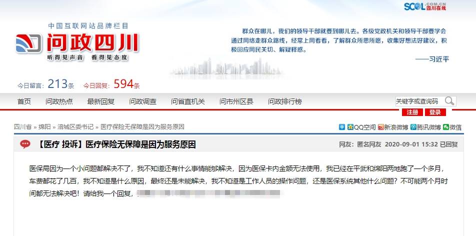 2020年9月1日,有网友在问政四川留言反映,因医保卡内金额无法使用,已在平武和绵阳两地跑了一个多月,最终还是未能解决问题。