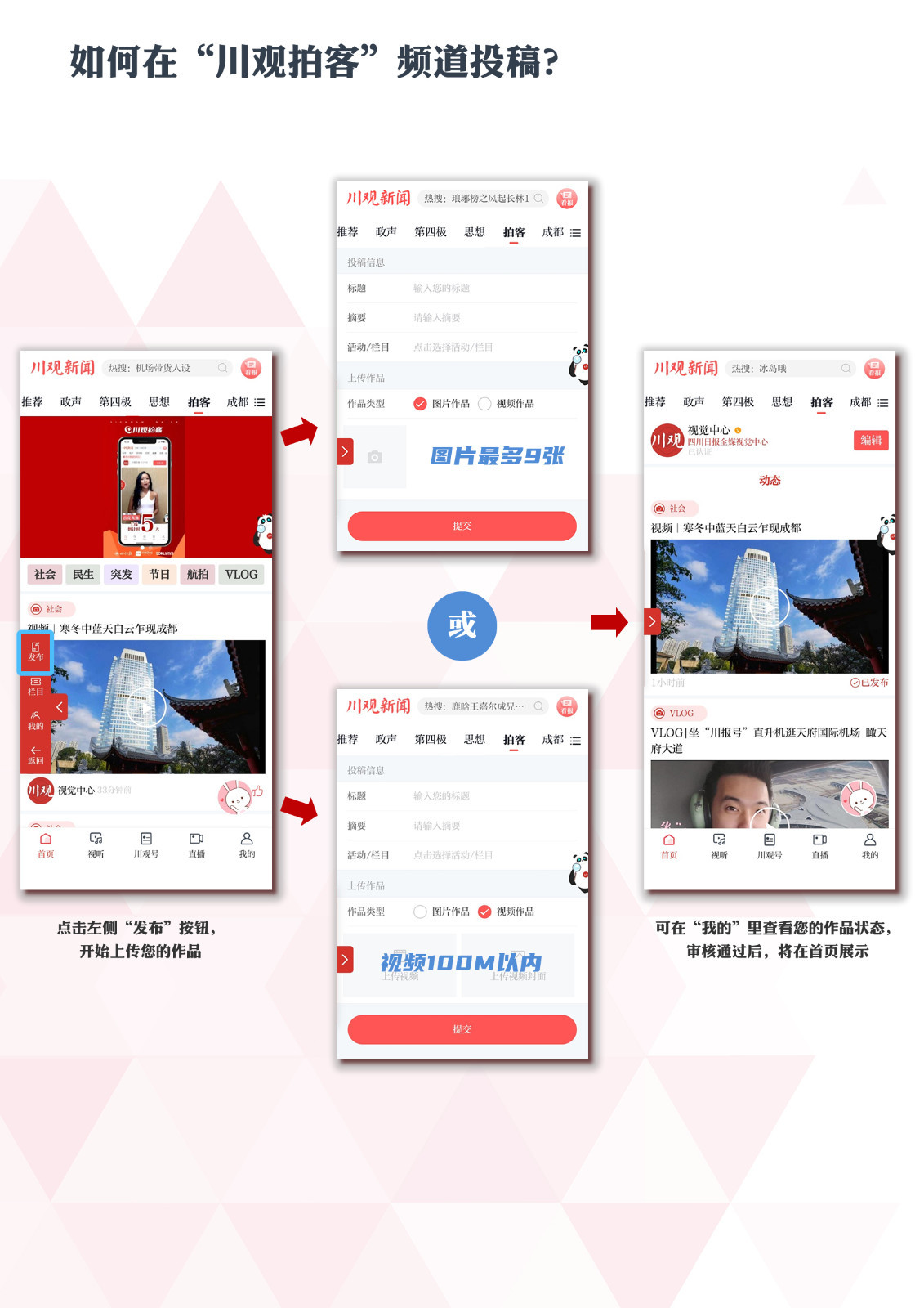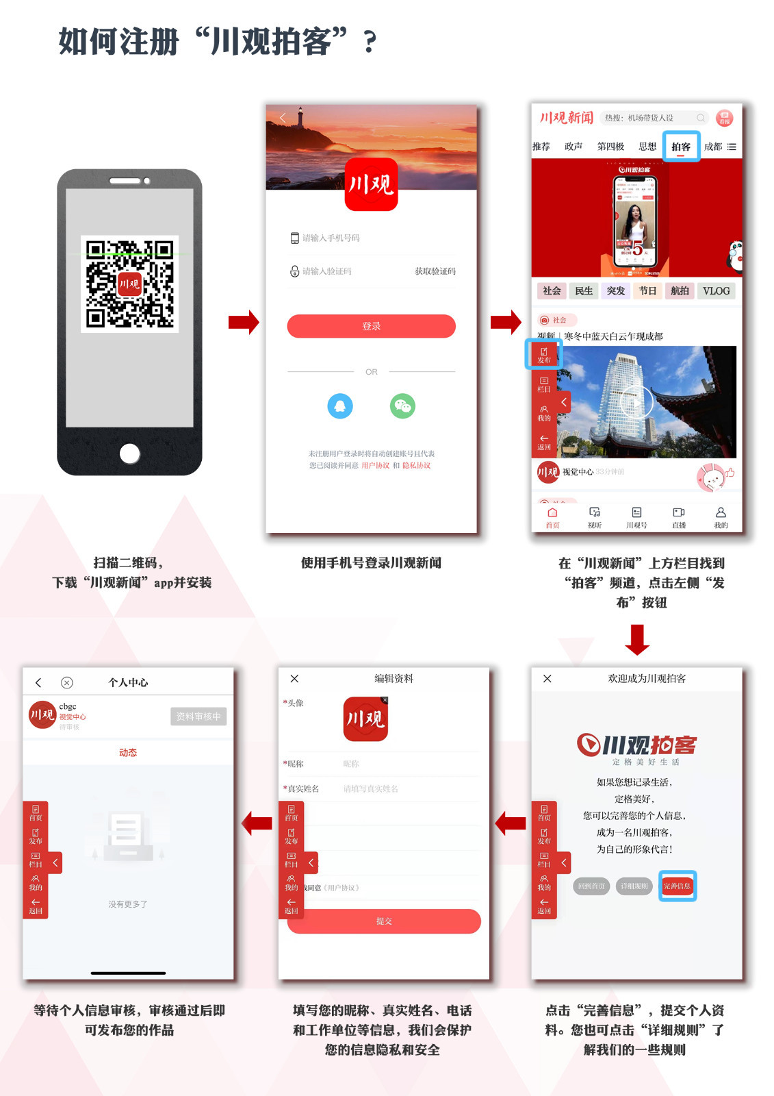 11月28日,川观拍客频道正式上线。如何注册成为一名川观拍客?如何投稿上传你的作品?来看看这个使用教程吧!轻松上手,与大家分享你的美好生活!
