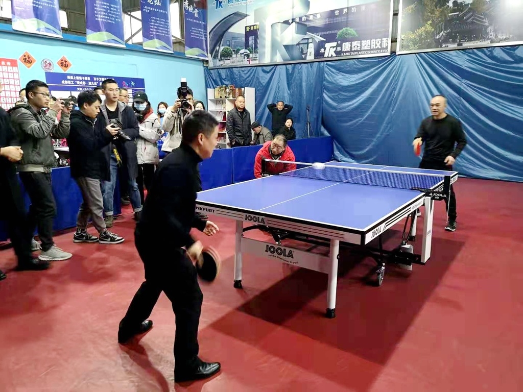 “奥运冠军来了!”11月28日,在崇州市康泰职工乒乓球俱乐部比赛现场,中国奥运历史上第一枚乒乓球金牌得主之一陈龙灿挥舞球拍,为成都职工“爱成都 迎大运”系列体育赛事之职工乒乓球团体大赛开球,并向成都市总工会赠送了具有纪念意义的签名球拍、运动服。