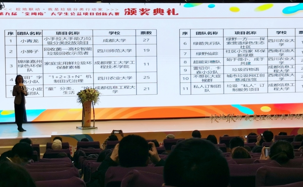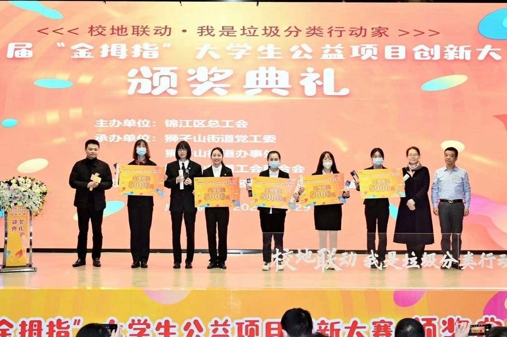 11月29日下午,由成都市锦江区总工会主办,狮子山街道党工委、狮子山街道办事处、狮子山街道工会联合会承办,成都市锦江区社会组织发展基金会协办的校地联动·我是垃圾分类行动家第九届“金拇指”大学生公益项目创新大赛落幕,并为获奖项目颁奖。经过现场路演、评审团现场投票方式,参赛团队角逐“金拇指奖”。最终,小手拉大手助力垃圾分类投放项目、城市垃圾网红创意减压馆项目、“1+2+3+N”机制田式治理项目、垃圾百物语项目、“童”分类,“绘”生活项目获得“金拇指”奖。