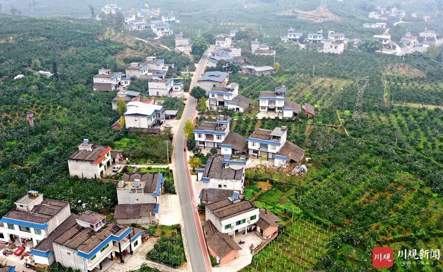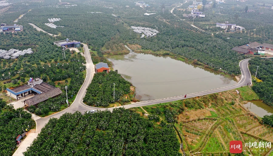 2020年11月29日,用无人机拍摄的眉山市丹棱县齐乐镇农村公路两旁成片的桔橙产业与农房,构成一幅美丽的乡村画卷。
