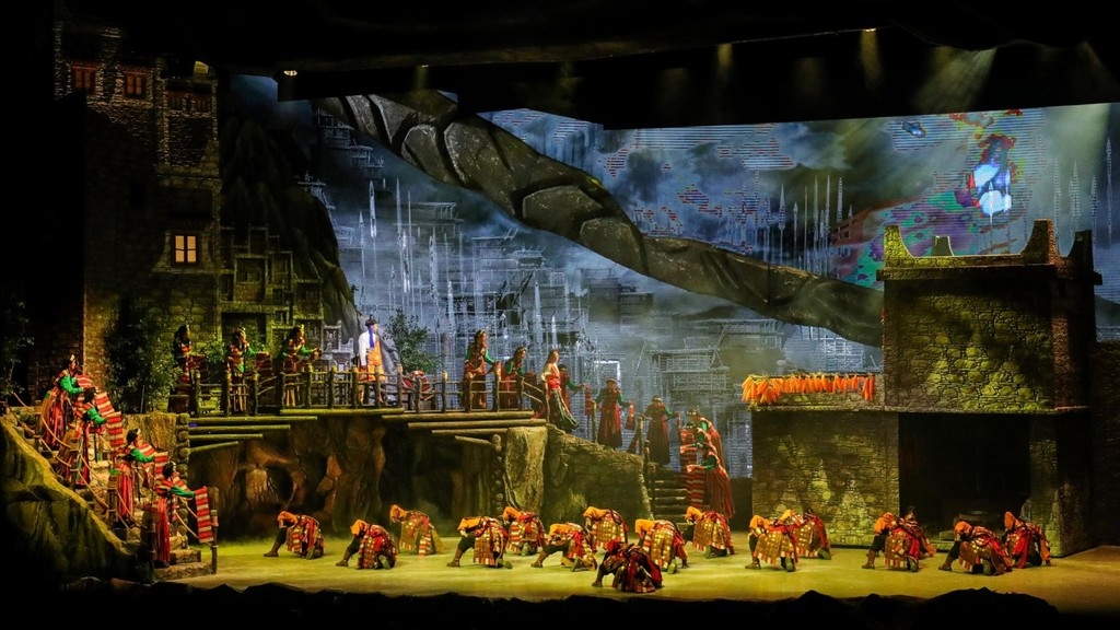 《斯古拉》歌舞剧分为族源传说、成人之礼、辫子魂、丰收之舞、尾声五个篇章,已于今年9月与观众见面。这也是容中尔甲继编创电影《阿拉姜色》后,经过五年时间精心打造的一台节目,以音乐、舞蹈、情节、民俗、习俗等多元文化为载体,展现嘉绒藏族文化的多彩魅力和精神风貌。