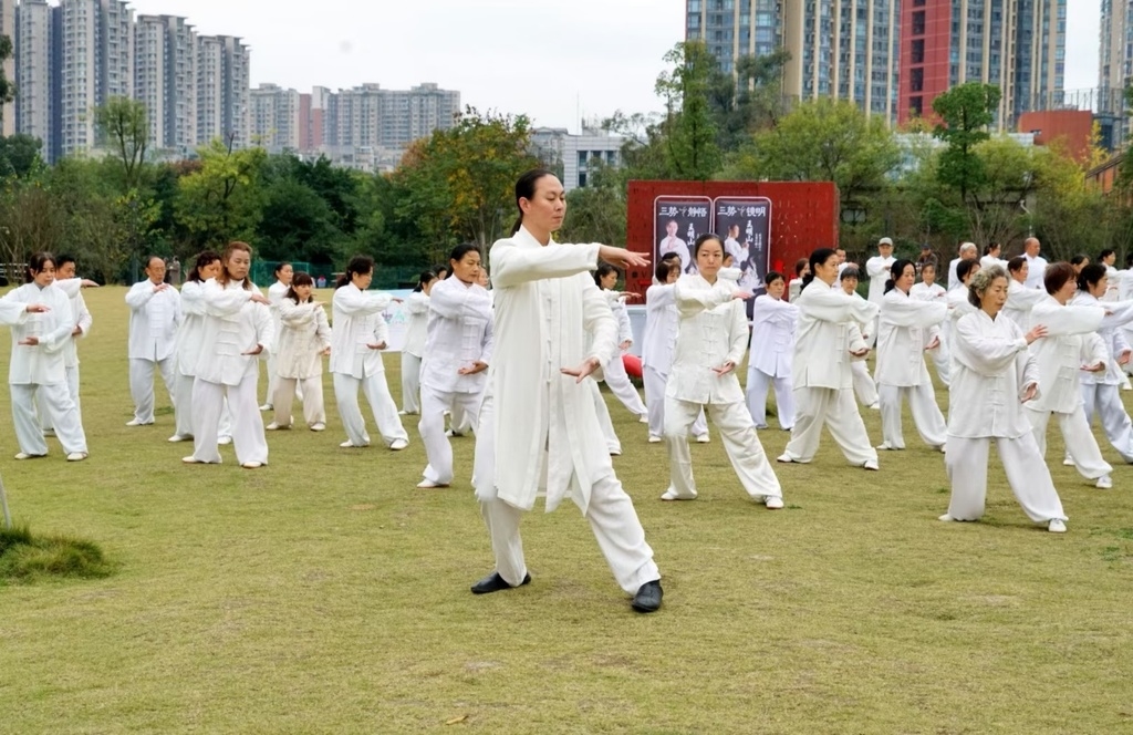 11月29日,由成都市成华区人民政府、重庆市九龙坡区人民政府主办的2020“成渝双城运动季”熊猫太极健康大会暨“爱成都·迎大运”成华区社区运动节太极拳比赛在成都市成华区熊猫体育公园和重庆市九龙坡区盘龙中央广场同时同步举行,共吸引川渝两地2000余太极爱好者参与其中。