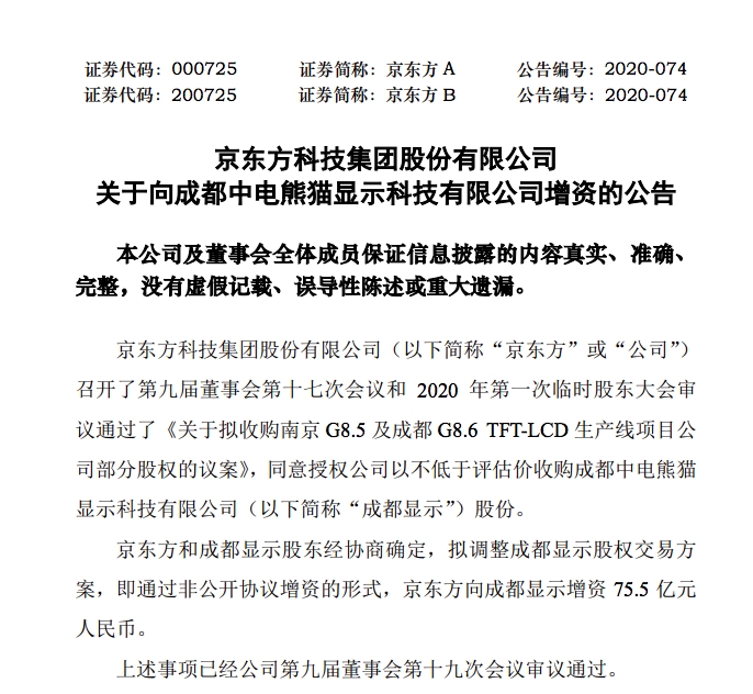 11月30日,京东方发布公告称,通过非公开协议增资的形式,京东方向成都中电熊猫显示科技有限公司(以下简称“成都显示”)增资75.5亿元人民币。
