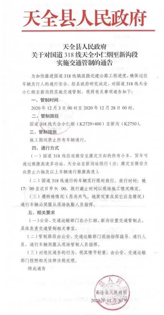 11月30日,记者从天全县人民政府获悉,为加快推进国道318线锅浪跷还建公路工程进度,确保过往车辆及行人的通行安全,经天全县人民政府研究决定,对国道318线天全小仁烟至新沟段实施交通管制。