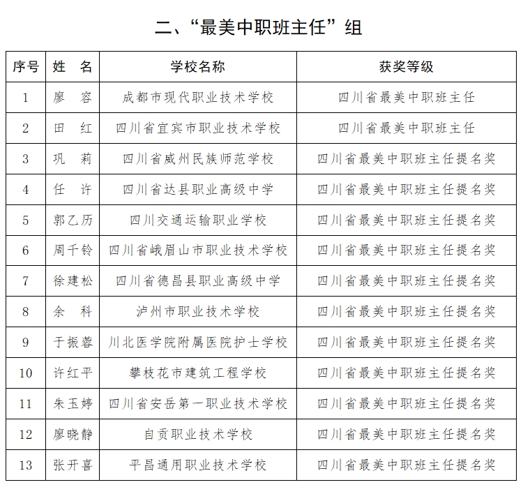 日前,四川省教育厅公布了四川省职业院校技能大赛中等职业学校班主任能力比赛的获奖名单。