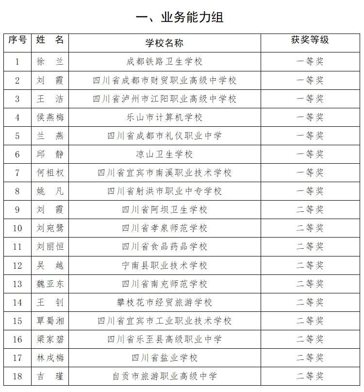 根据有关精神,按照公平、公正、公开、择优的原则,经学校申报、市(州)教育行政部门推荐、省级专家评审,并经公示无异议,四川省教育厅确定中等职业学校班主任能力大赛获奖名单,其中“业务能力组”18名,“最美中职班主任组”13名。现将获奖名单予以公布。