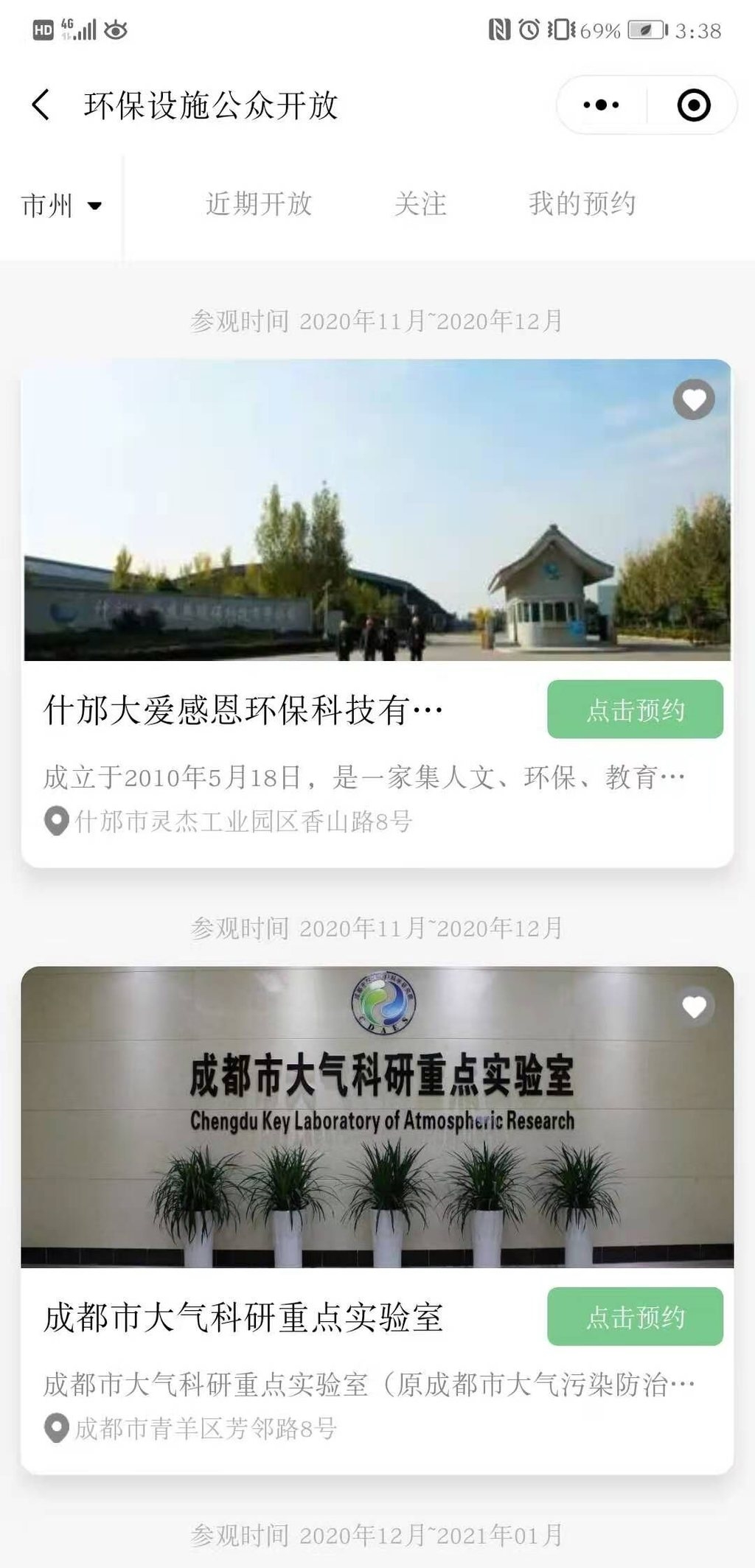12月1日,记者在“四川生态环境”微信公众号菜单栏点击环境教育栏目进入小程序,并点击“环保设施公众开放”。页面上出现了各个参观点位的图文链接。根据页面上方的栏目,既能按市州查到“藏”在你家附近的参观点位,也能按时间查询最近开放的参观点位。对于感兴趣的参观点,还可以点击关注纳入关注列表。