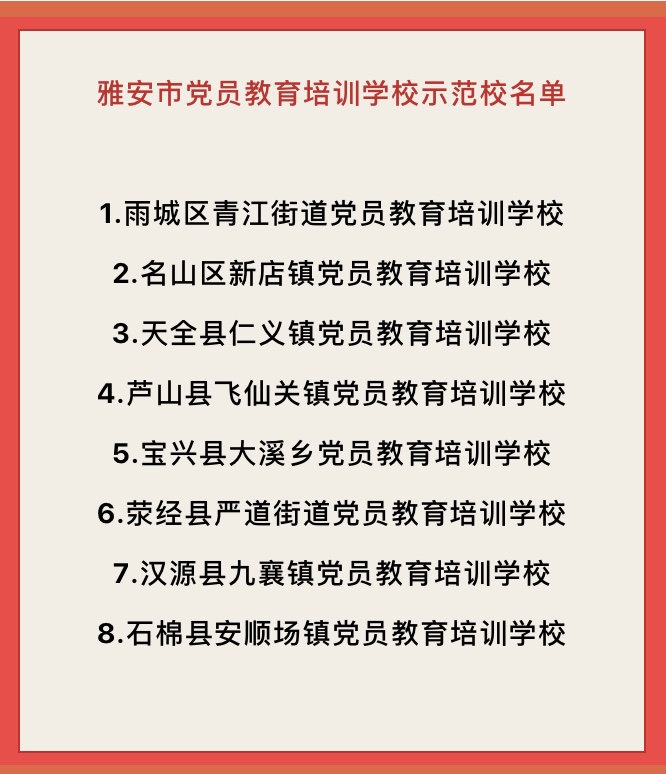 12月1日,记者从雅安市委组织部获悉,近日,市委组织部命名了雅安市雨城区青江街道党员教育培训学校等8个单位为市级党员教育示范校,雅安烈士陵园等9个单位为市级示范基地。