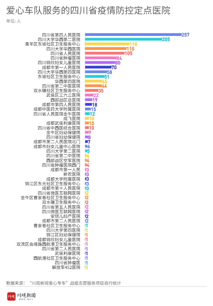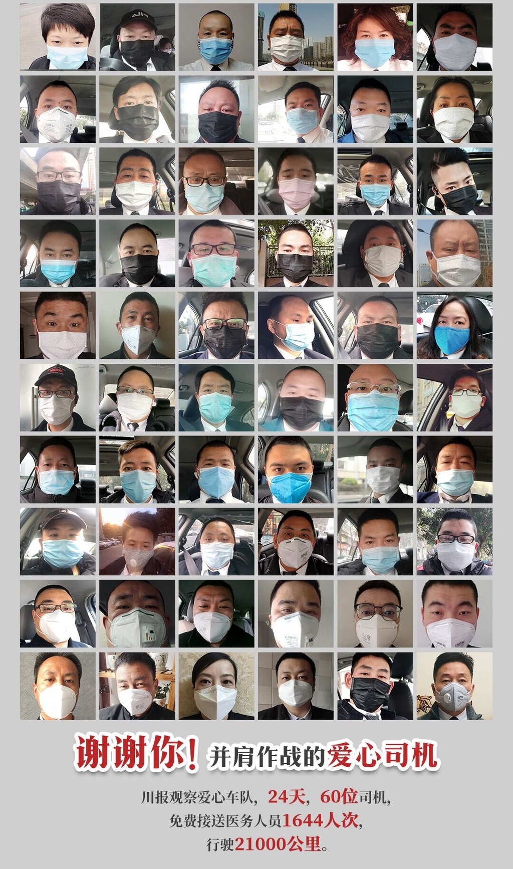 川观新闻和曹操出行、神马专车等共同组织的“川观新闻爱心专车”战疫志愿服务项目,让奋战在防疫一线的医护人员只要提前预约,就有专车司机免费到指定地点接送,既能享出行便利,也能免去乘坐公共交通给自己和他人带来的可能交叉感染的困扰。从2月18日至3月13日,川观新闻爱心车队走过24天,服务的医护人员已达1644人次,总里程约21000公里,这距离相当于跨越山海、横穿中国5次,比地球北极到南极还远。踊跃报名加入“爱心专车”的司机中,既有党员、退伍军人,也有普通群众,他们以这种方式,为疫情期间“逆行”的白衣天使们奉上自己特别的关爱。