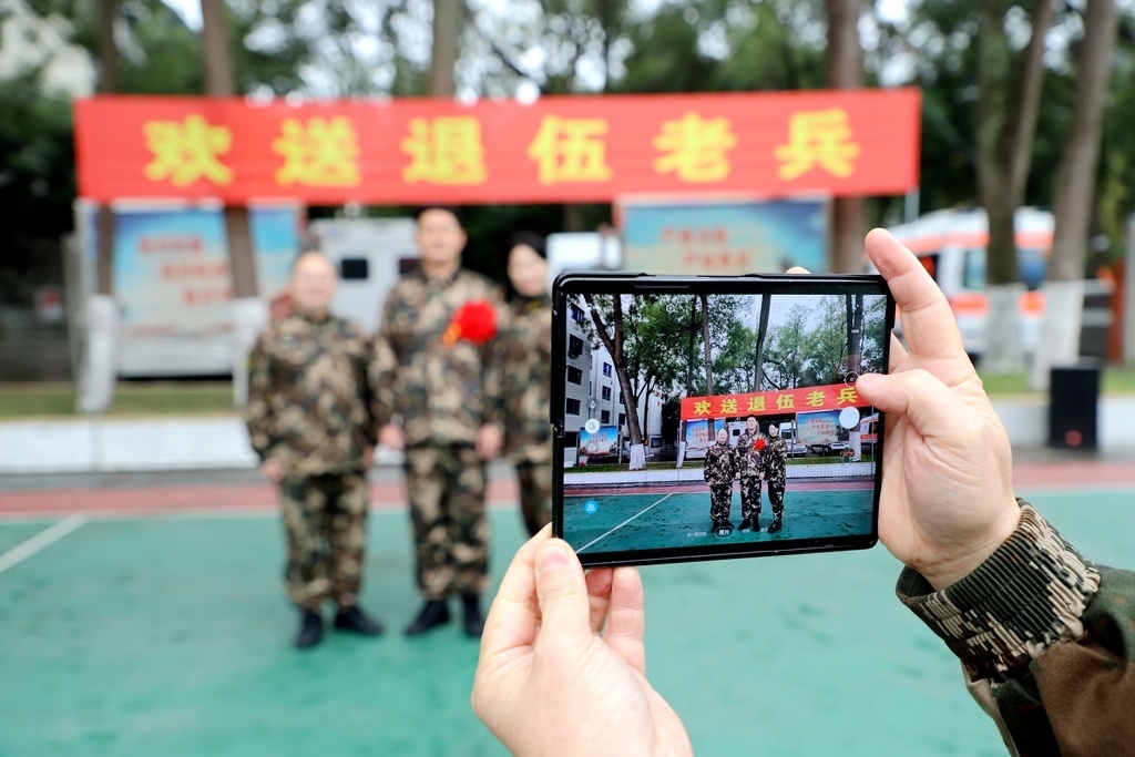 “退伍不褪色,退役不退志,我们将永葆忠诚本色,永守奋斗初心,牢记军人使命……若有战,召必回。”退役老兵代表杨岳衡作了感情真挚的发言,表达了对军营生活的留恋和对战友们的依依惜别之情。
