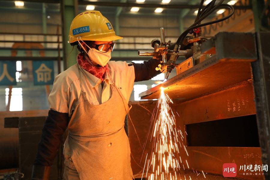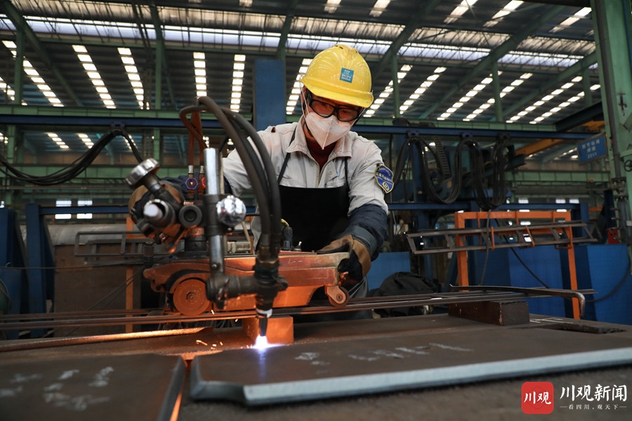 眉山市眉山四川天府新区中建钢构(四川)有限公司生产车间内,工人在忙碌焊接加工零部件。