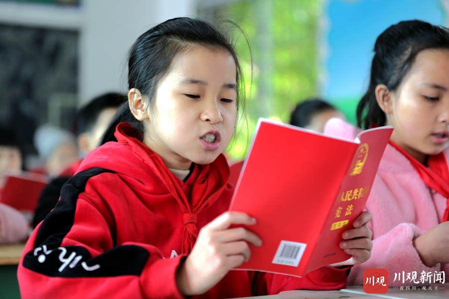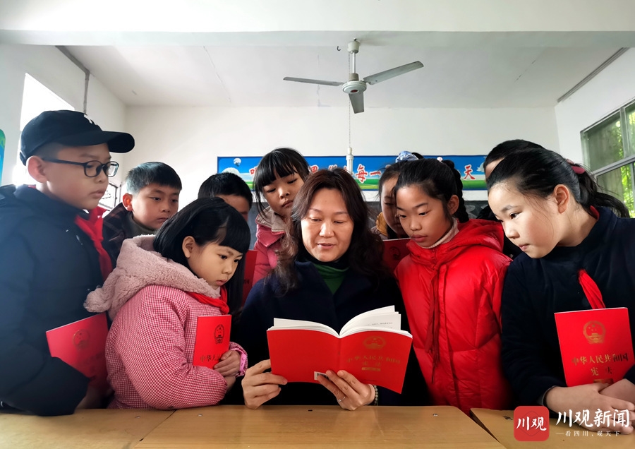 12月3日,仁寿县彰加镇小学校四年级二班,老师正在给学生发放宪法读本。