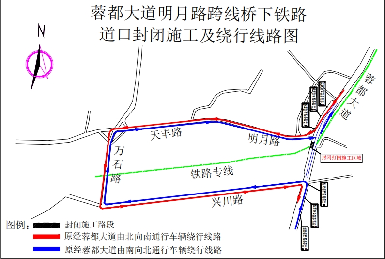 12月3日,记者从成都市公安局交通管理局获悉,为保障蓉都大道明月路跨线桥下辅道铁路道口铁路大修工程的顺利实施,维护施工路段交通的安全与畅通,根据《中华人民共和国道路交通安全法》第三十九条、第九十条等有关法律、法规的规定,2020年12月8日至2020年12月27日,蓉都大道明月路跨线桥下辅道铁路道口封闭施工,禁止机动车通行;非机动车、行人在确保安全的前提下按照交通导向标志的指示谨慎通行。